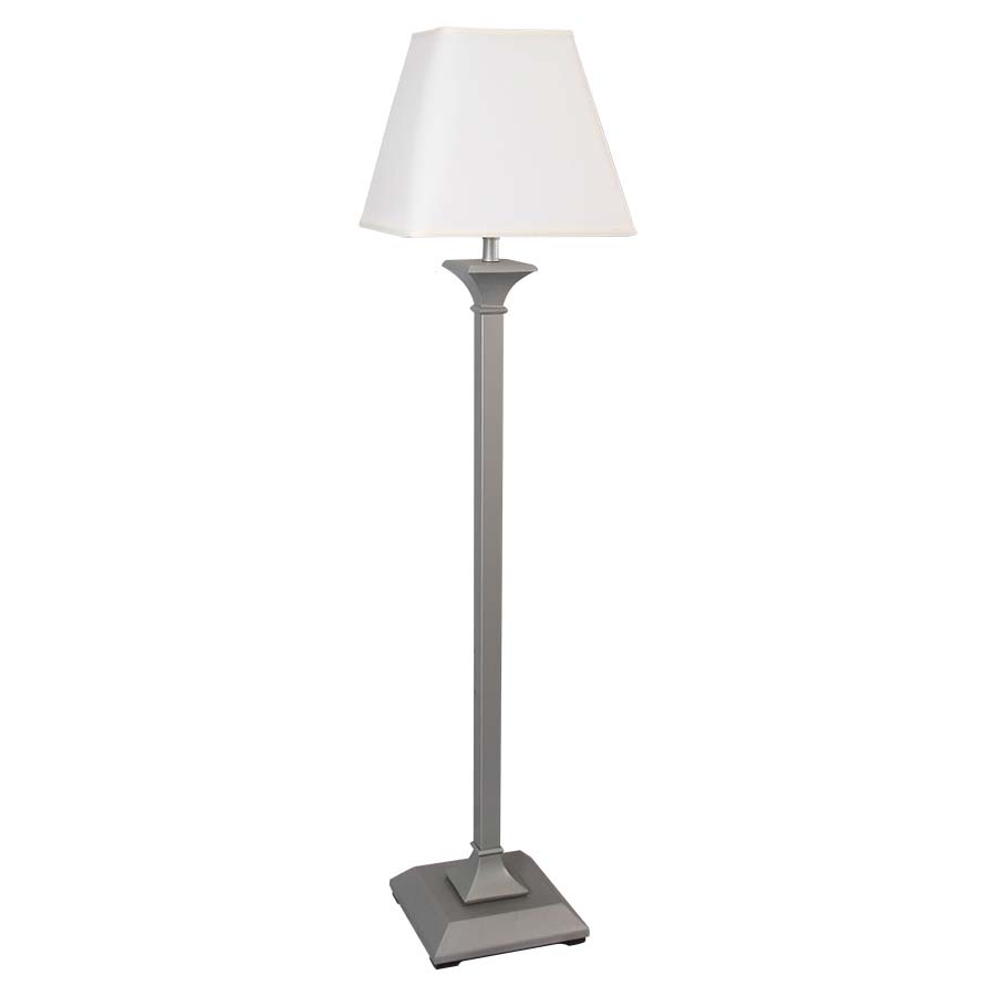 59.5"H Platinum Silver Floor Lamp, medium base socket with on/off push thru socket switch, 15' Silver 45° cord, 8"x8"x14"x14"x12" Square White Linen Hardback Shade. Recommend 1100 lumen LED bulb.