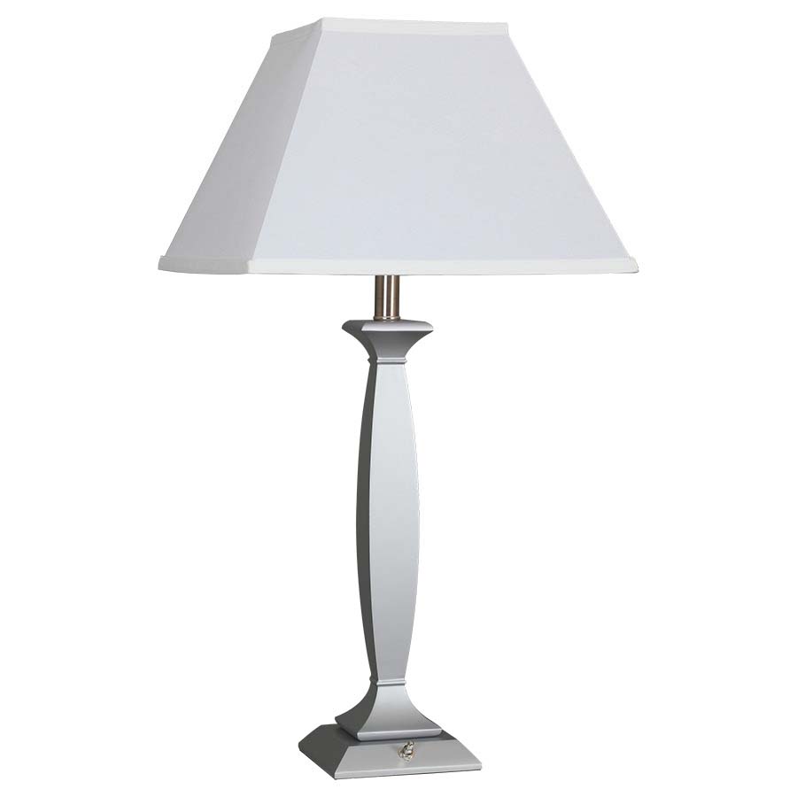 Platinum Silver Table Lamp, medium base socket, on/off push button base switch,8' Silver 45° cord, 5x5x16x16x12 Square White Linen Hardback Shade. Recommend 1100 lumen LED bulb.