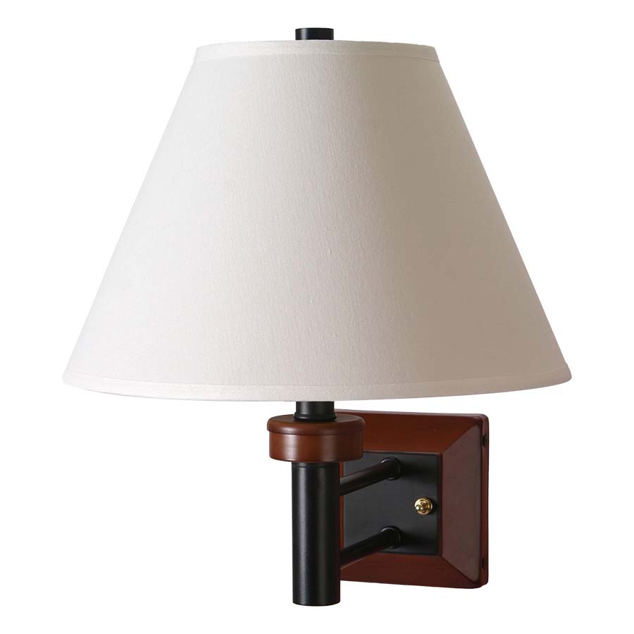 15"H Matte Black Single Wall Lamp with Williamsburg Cherry Accents, medium base socket, on/off push button switch, 8' Black 45° cord, 24" Matte Black cord cover. 6x13x9 White Linen Hardback shade. Recommend 1100 lumen LED bulb.
