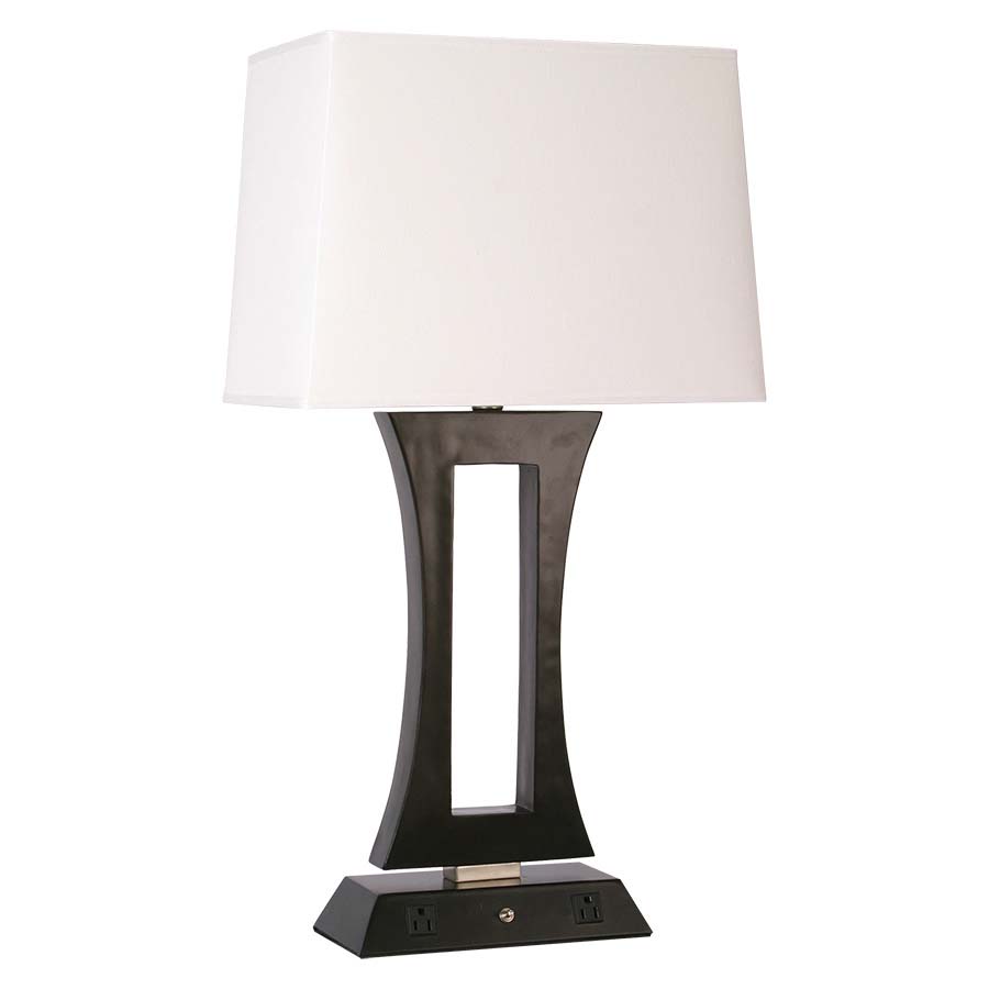 32"H Espresso and Brushed Nickel Table Lamp, medium base socket, on/off push button base switch, 8' Silver 45° 3-prong grounded cord, two outlets, 8"x15"x9"x17"x12" Rectangle White Linen Hardback Shade. Recommend 1100 lumen LED bulb.