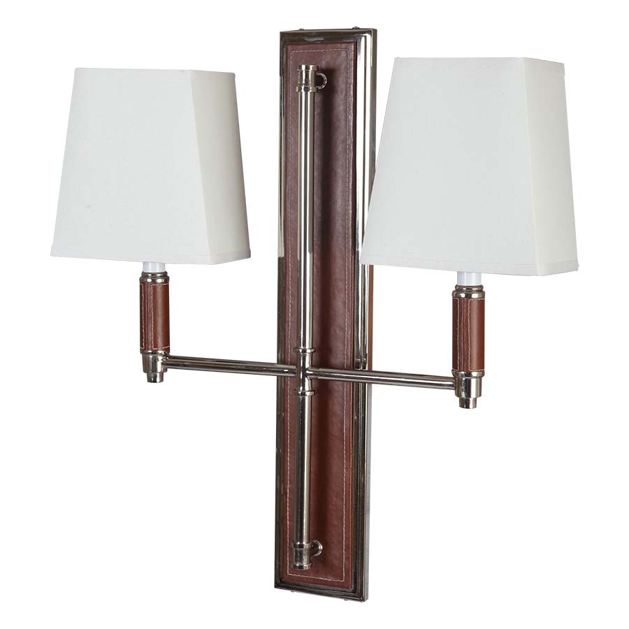 21"H Polished Nickel and Faux Brown Leather Double Wall Lamp, two medium base sockets, direct wired, 3.75"x5"x3.75"x7"x7.5" Parchment Linen Hardback Shades. Recommend two 1100 lumen LED bulbs.