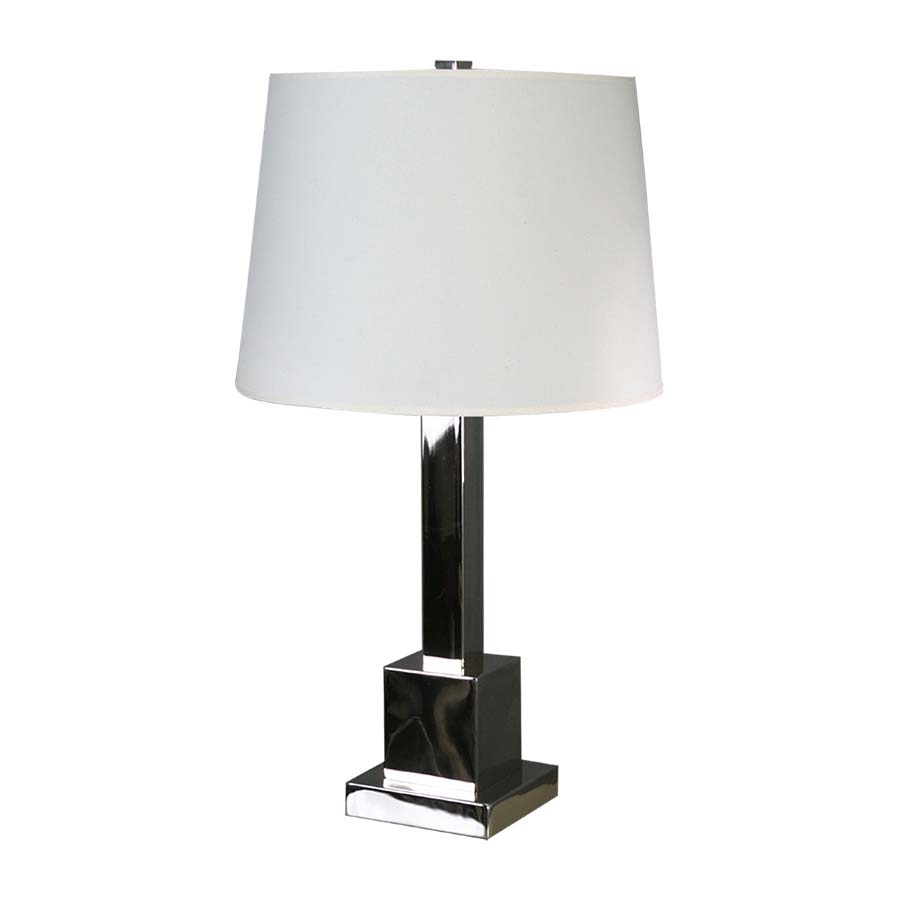 32.25"H Polished Nickel Table Lamp, dual medium base socket, 8' Silver 45° cord with in-line switch, 13"x19"x12.5" Parchment Linen Hardback Shade. Recommend two 1100 lumen LED bulbs.