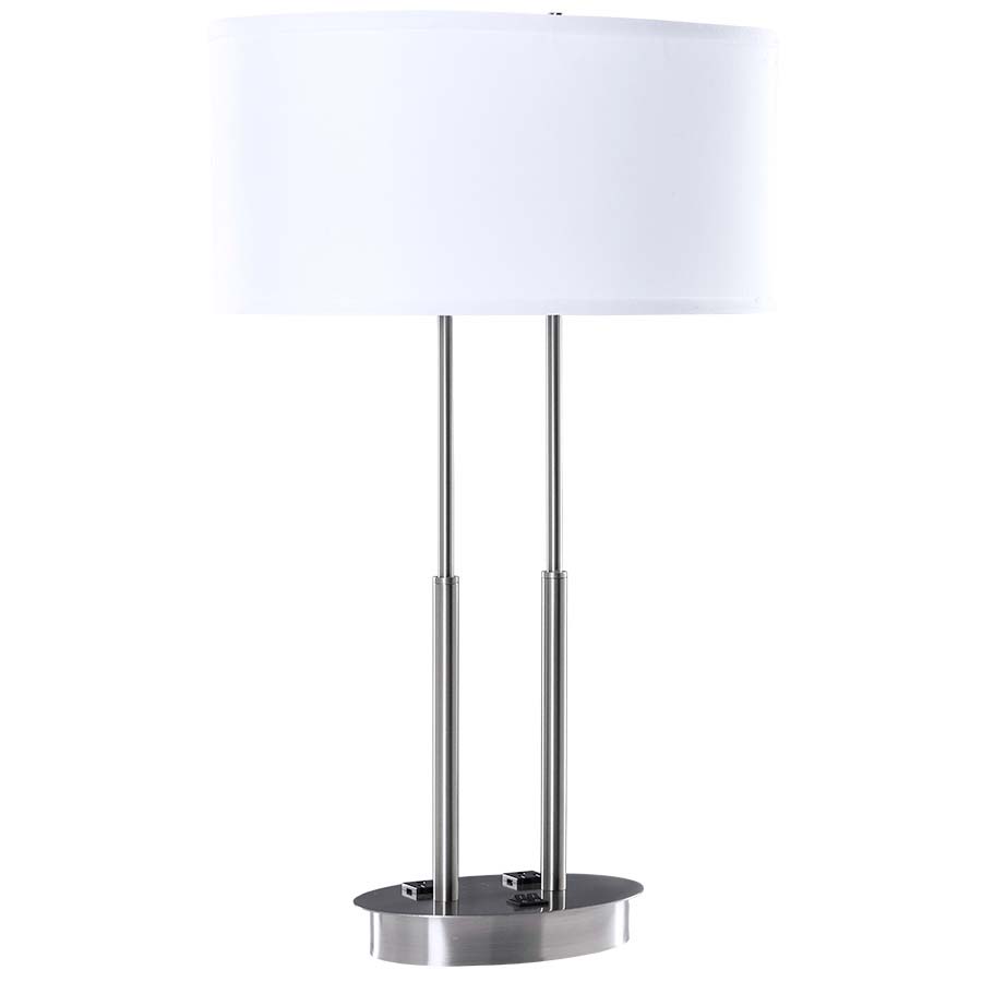 26" Brushed Nickel Table Lamp with two medium sockets, two convenience outlets, 3-way push button base switch, 8' Silver 45° 3-prg grounded cord, RJ45 data port. Includes 12"x17"x12"x17"x8" White Linen Oval HB Shade. Recommend two 1100 lumen LED bulbs. (Alt. # 6165E2OP)