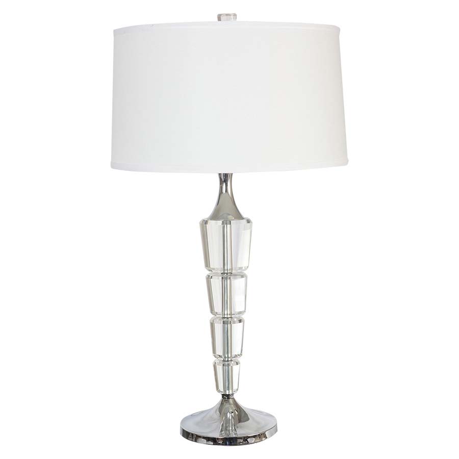 26"H Crystal and Chrome Table Lamp, medium base socket with on/off push thru socket switch, 8' Silver 45° cord, 14x15x10 White Linen Hardback Shade. Recommend 1100 lumen LED bulb.