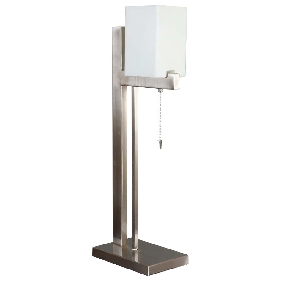 27.75" Brushed Nickel Table Lamp, medium base socket, on/off rocker base switch, 8' Silver 45° cord, 4"x5"x4"x5"x7.5" Frosted White Glass Shade. Recommend 1100 lumen LED bulb.