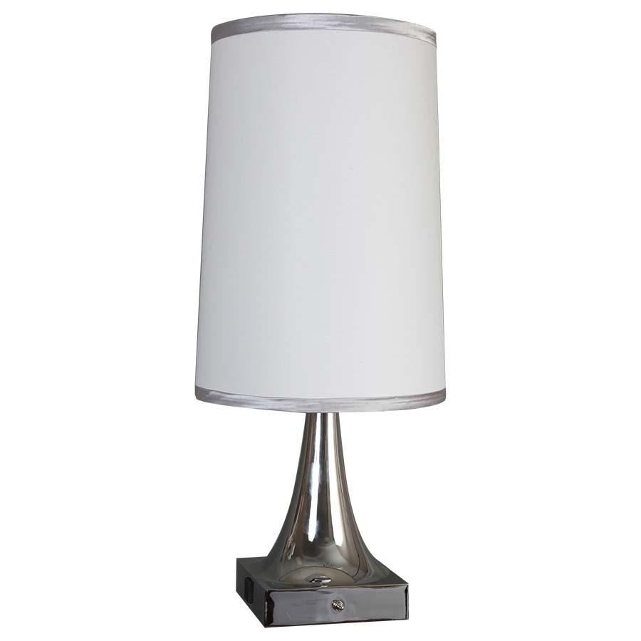 28.5"H Polished Chrome Table Lamp made from Cast Aluminum, medium base socket, on/off push button base switch, two outlets, 8' Silver 45° 3-prong grounded cord 11"x12.5"x18" White Linen Hardback Shade with Silver Trim. Recommend 1100 lumen LED bulb.