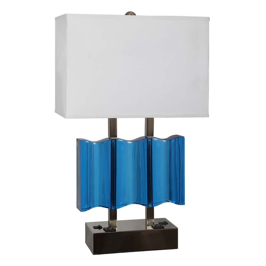 26"H Brushed Nickel and Blue Resin Table Lamp, dual medium base socket, two on/off rocker base switches, 8' Silver 45° 3-prong grounded cord, two outlets, 7"x14"x7"x14"x10" White Linen Hardback Shade. Recommend two 1100 lumen LED bulbs.