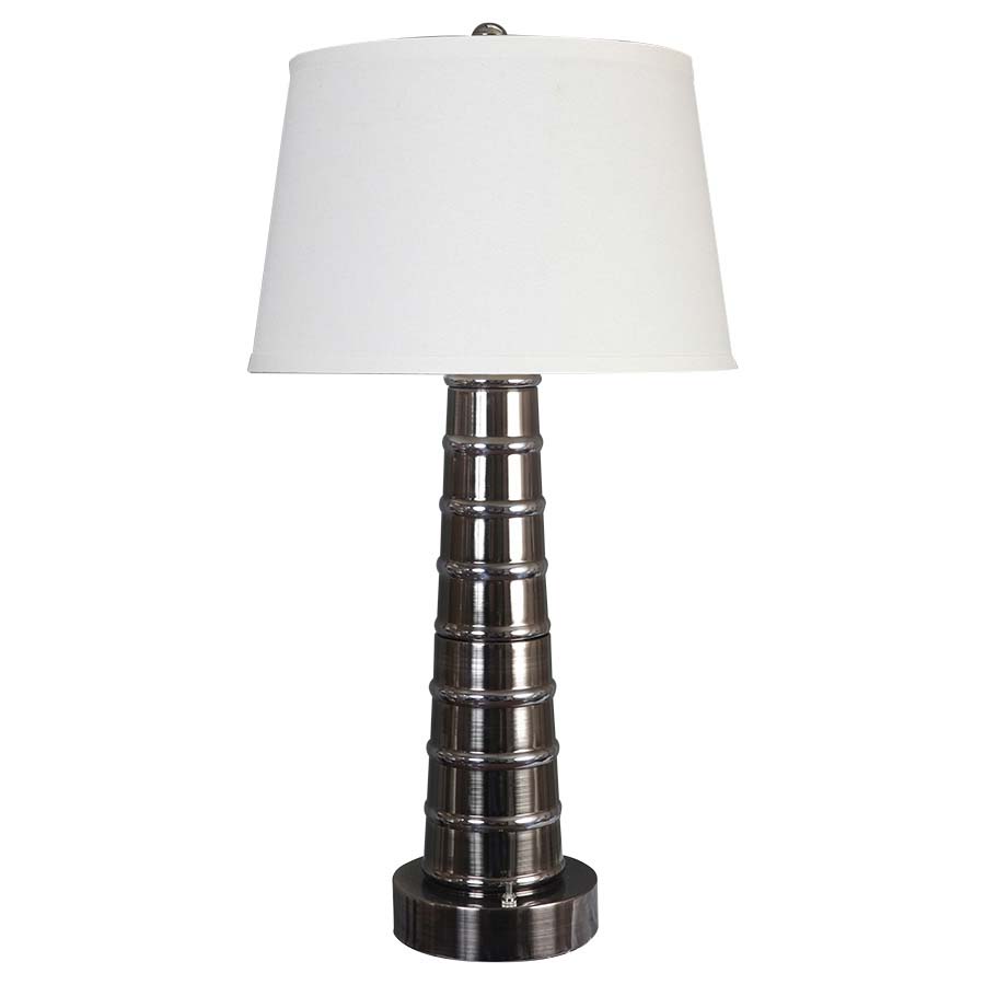 29.5"H Brushed Nickel Table Lamp, dual medium base socket, dual on/off rocker base switch, 8' Silver 45°3-prong grounded cord, two outlets, 13"x16"x10" Cream Linen Hardback Shade. Recommend two 1100 lumen LED bulbs.