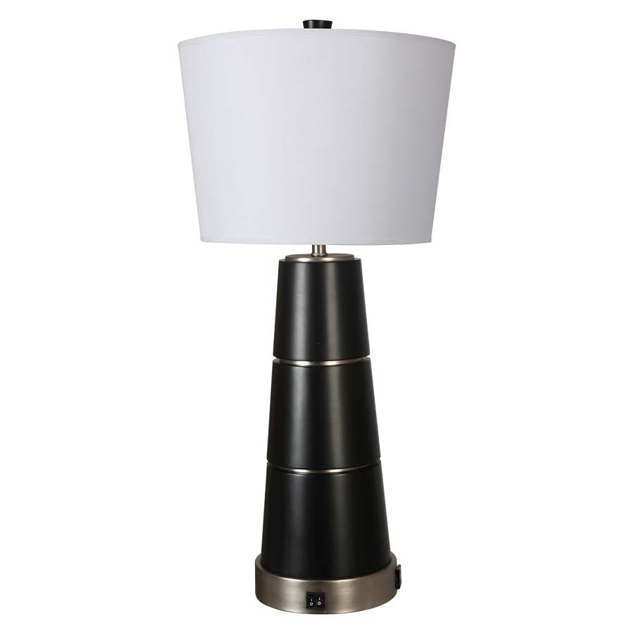 30" H Dark Roast and Matte Brushed Nickel Table Lamp,medium base socket, on/off rocker base switch, one outlet, 8' Silver 45° 3-prong grounded cord, 14"x12"x10" White Linen Hardback Shade. Recommend 1100 lumen LED bulb.