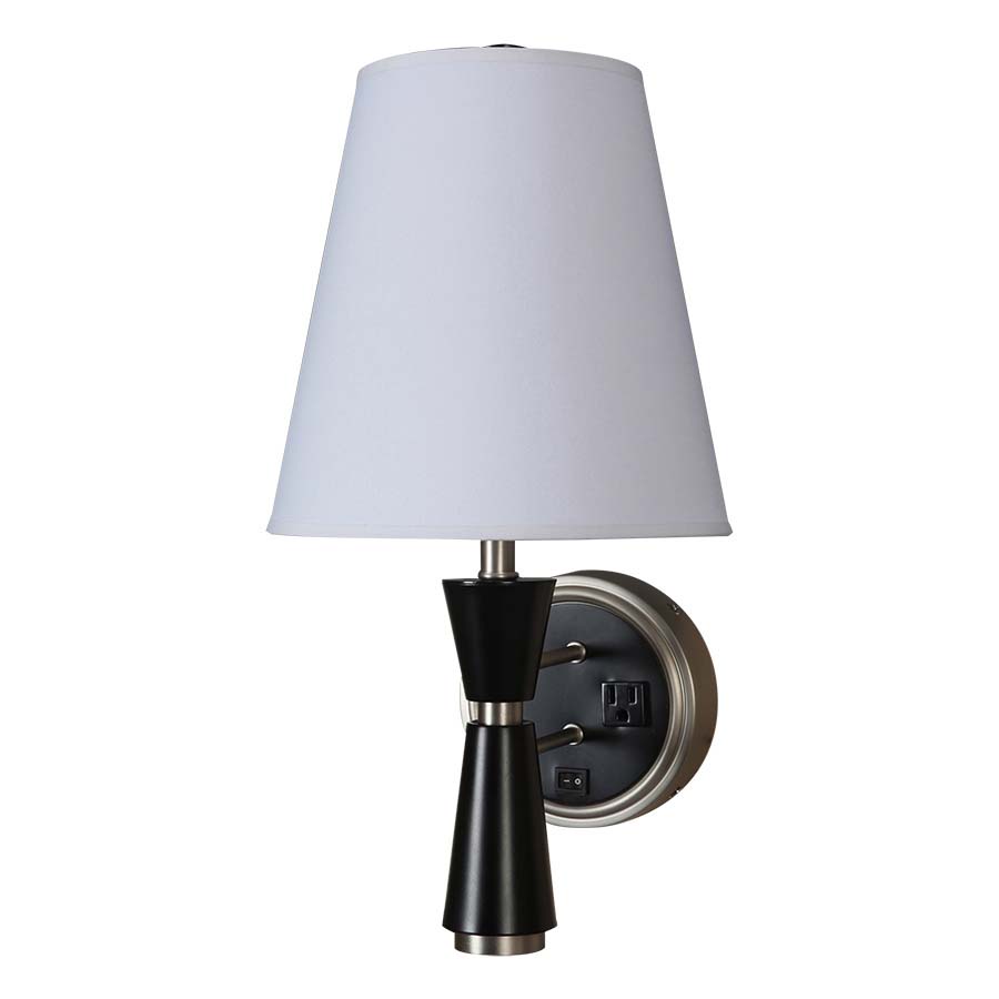 Dark Roast and Matte Brushed Nickel Single Wall Lamp, medium base socket, on/off rocker switch at backplate, 8' Silver 45° 3-prong grounded cord, one outlet. Includes 6"x10"x10" White Linen HB Shade. 10"W,19.5"H,10.5"D. Recommend 1100 lumen LED bulb