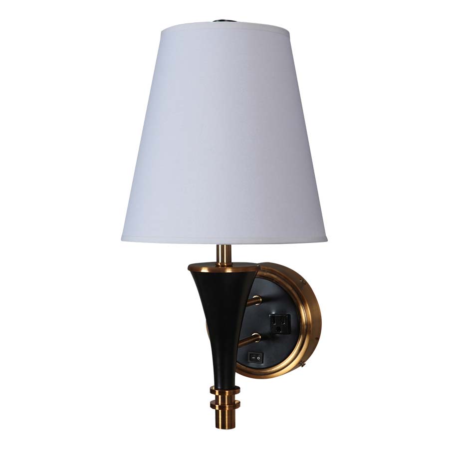 Burnished Brass and Dark Roast Single Wall Lamp, medium base socket, on/off rocker switch at backplate, 8' Silver 45° 3-prong grounded cord, one outlet, 6"x10"x10" White Linen Hardback Shade. 19.5"H, 10.5"D. Recommend 1100 lumen LED bulb.