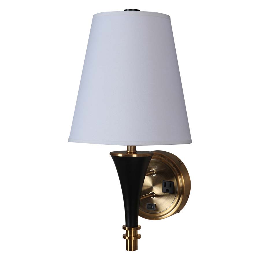 Burnished Brass and Dark Roast Single Wall Lamp, medium base socket, on/off rocker switch at backplate, 8' Silver 45° 3-prong grounded cord, one outlet, 6"x10"x10" White Linen Hardback Shade. 19.5"H, 10.5"D.Recommend 1100 lumen LED bulb.