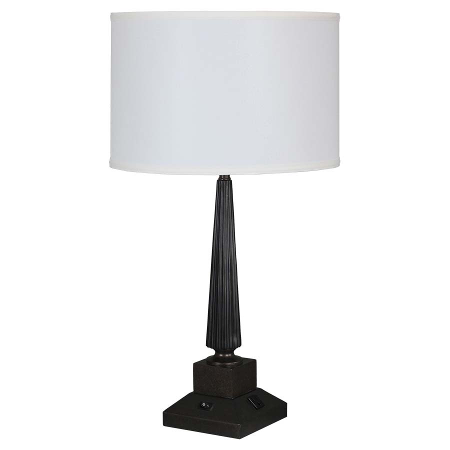 29.5"H Naples Bronze and Dark Roast Table lamp, medium base socket, on/off rocker base switch, 8' Silver 45° 3-prong grounded cord, one outlet, 16"x16"x10.5" Cream Linen Hardback Shade. Recommend 1100 lumen LED bulb.