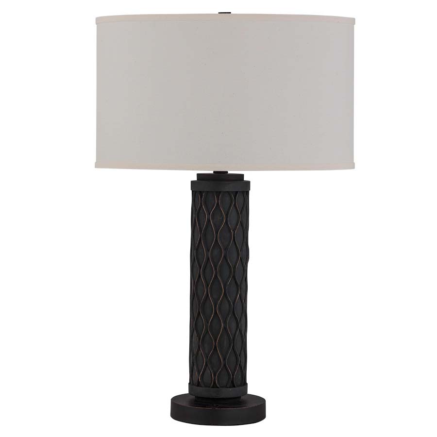 31.5"H Portland Bronze Table Lamp, dual medium base socket, dual on/off rocker base switch, 8' Silver 45° cord, 11"x19"x11"x19"x11" Oval Natural Linen Hardback Shade. Recommend two 1100 lumen LED bulbs.