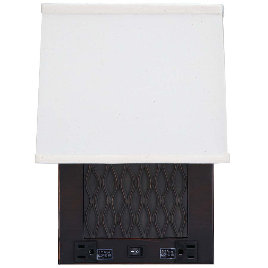 11.75"H Portland Bronze Single Wall Lamp, GU24 socket, on/off rocker switch at backplate, two outlets, direct wired, 4x8.5x5x9x7.5 Natural Linen Shade. Recommend 1100 lumen LED bulb with GU24 base