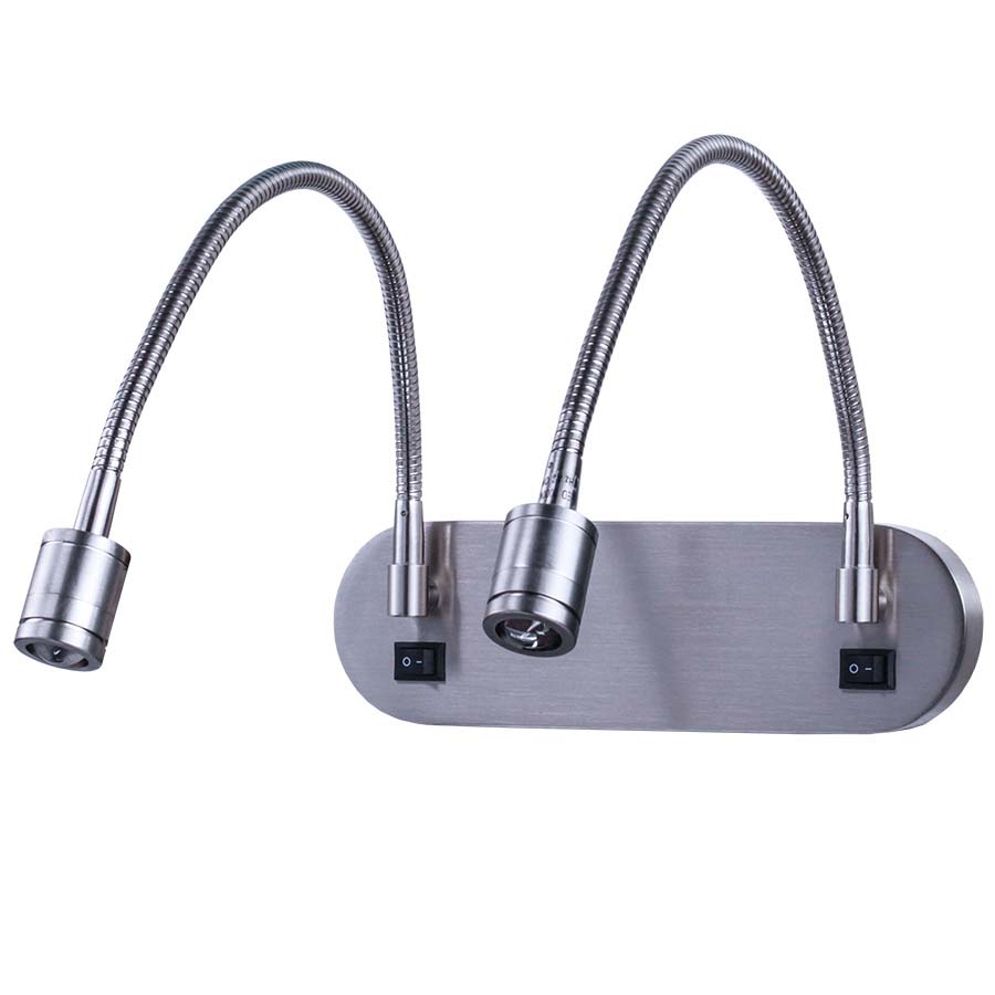 19"H Brushed Nickel LED Double Wall Lamp with two on/off rocker switches. Mounts to a headboard or equivalent. Includes two integrated 3 watt LED bulb. 8' cord with required LED driver integrated with the plug.
