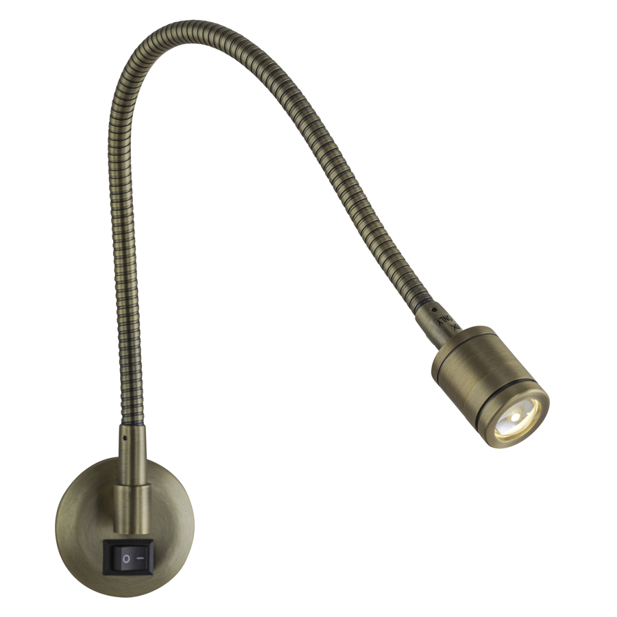 19"H Brushed Brass LED Wall Lamp with on/off rocker switch. Mounts to a headboard or equivalent. Includes integrated 1 watt LED bulb. 6' cord with required LED driver integrated with the plug.