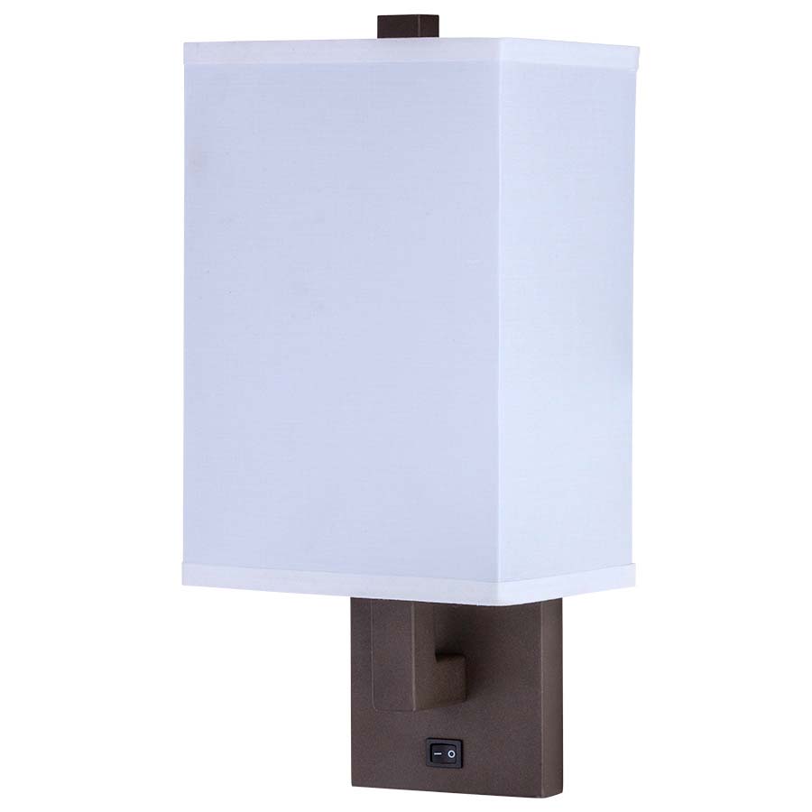 16-3/8"H Naples Bronze Single Wall Lamp, medium base socket, on/off rocker switch at backplate, 8' Silver 45° cord exits through back of lamp, 5.5"x7.5"x5.5"x7.5"x11" White Linen Hardback Shade. Recommend one 1100 lumen LED bulb.