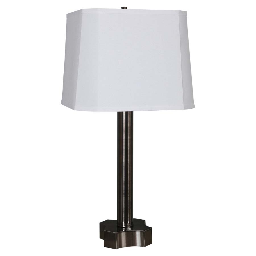 28.5"H Black Nickel Table Lamp, dual medium base socket, dual on/off rocker base switch, 8' Silver 45° 3-prong grounded cord, two outlets, 12x12x14x14x11 White Linen Hardback Shade. Recommend two 1100 lumen LED bulbs.