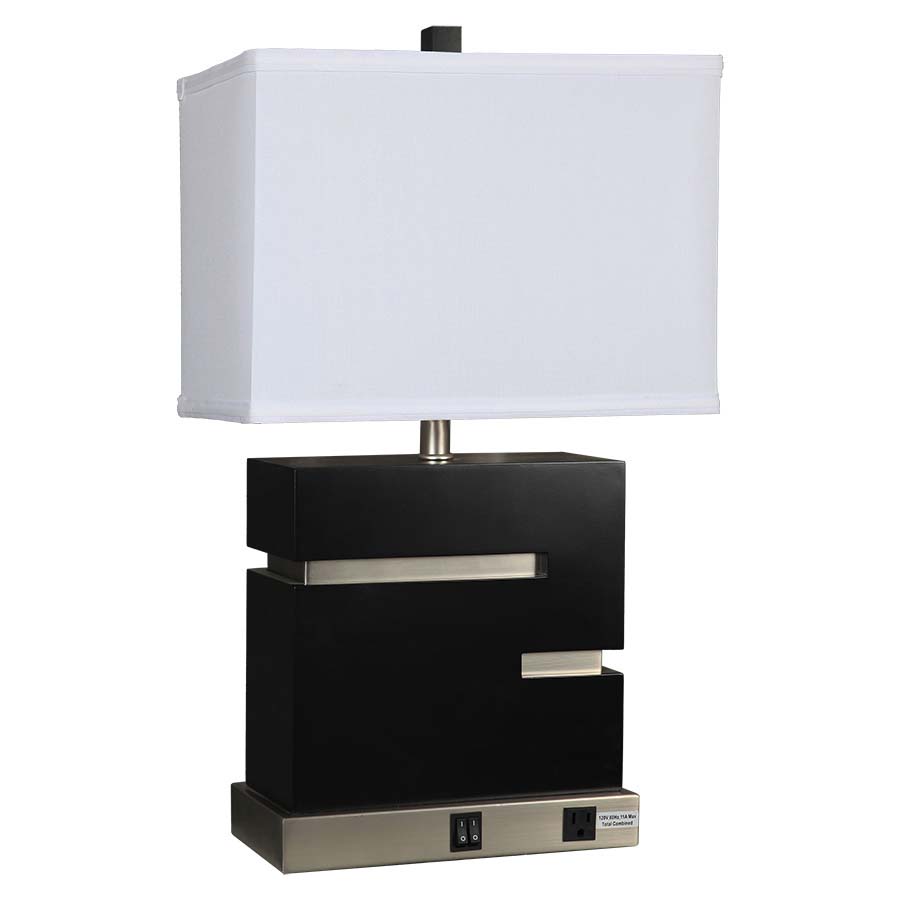 25.75"H Dark Wood Table Lamp with brushed nickel accents, medium base socket, on/off rocker base switch, 8' Silver 45°3-prong grounded cord, one convenience outlet, 9x15x9x15x11 White Linen hardback shade. Recommend 1100 lumen LED bulb.