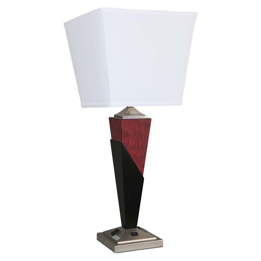 29"H Distressed Red and Matte Black Table Lamp with Brushed Nickel accents, medium base socket, on/off rocker base switch, 8' Silver 45° 3-prong grounded cord, two outlets, 12.5x12.5 x9.5x9.5 x11 White Linen Hardback shade. Recommend 1100 lumen LED bulb