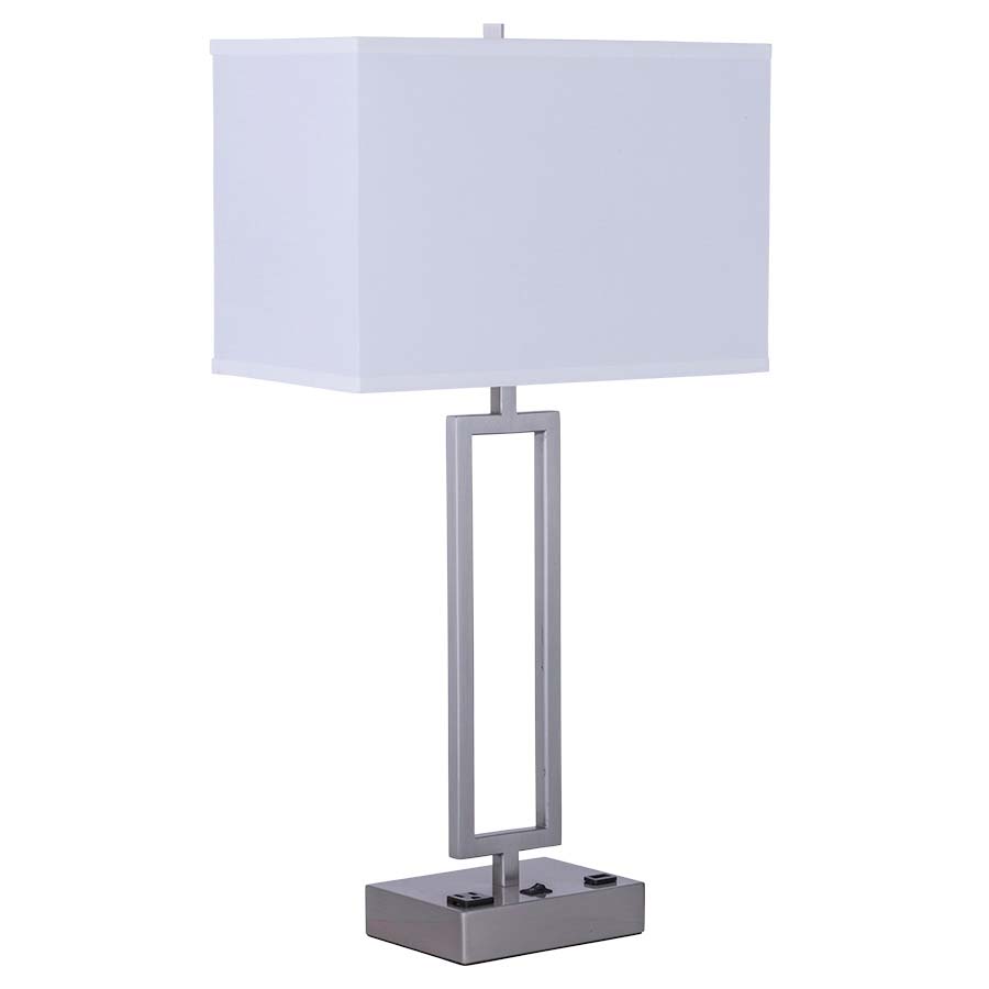 28"H Brushed Nickel Table Lamp, medium base socket, on/off rocker base switch, one outlet, one USB port, 8' Silver 45° 3-prong grounded cord, 8x15x8x15x10 White Linen Hardback Shade. Recommend 1100 lumen LED bulb