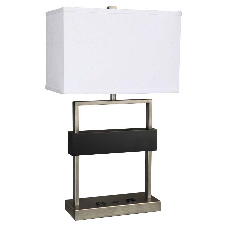 26.25" PC Silver and Black Table lamp dual medium base socket, dual on/off rocker base switch, two convenience outlets, 8' Silver 45° 3- prong grounded cord, 9x15x9x15x10 Rectangular White Linen HB Shade. Recommend two 800 lumen LED bulbs.