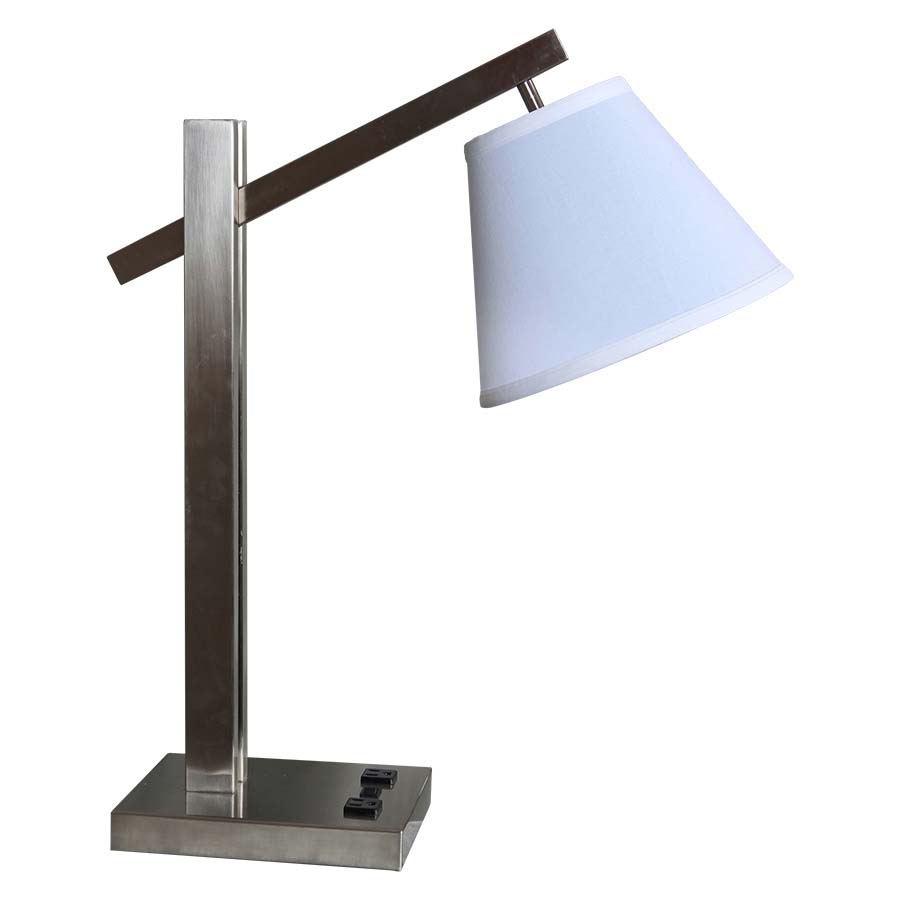 25.25"H Brushed Nickel Table Lamp, medium base socket, on/off rocker base switch, two outlets, Shade swivels 360°, arm is fixed position, 8' Silver 45° 3- prong grounded cord. 5x10x8 White Linen Hardback Shade. Recommend 1100 lumen LED bulb.