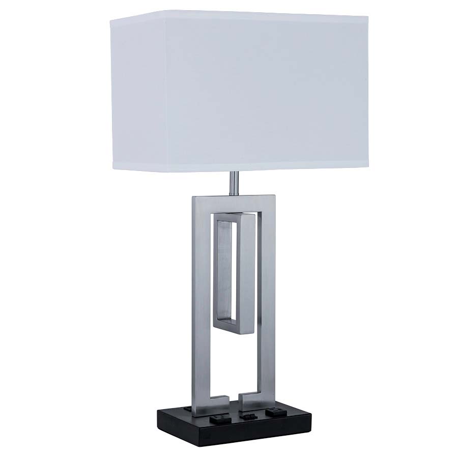28"H Brushed Nickel with Matte Black Base Table Lamp, dual medium base socket, dual on/off rocker base switch, 2-outlets, 2-dual USB ports, 8' Silver 45° 3-prg grounded cord, 9x15x9x15x10 Rectangle White Linen HB Shade. Recommend two 1100 lumen LED bulbs.