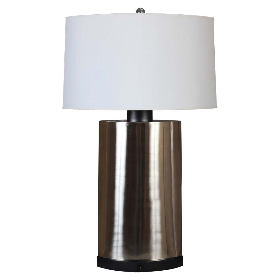 30.5"H Brushed Nickel Table Lamp with Yorkshire Cherry accents, medium base socket, on/off rocker base switch, two outlets, 8' Silver 45° 3-prong grounded cord, 9x17x11x18x10.5 Pinched Oval White Linen HB Shade. Recommend one 1100 lumen LED bulb.