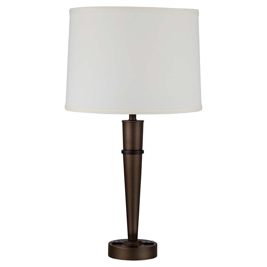 28"H Naples Bronze Table Lamp with Espresso accent ring, medium base socket, on/off rocker base switch, two convenience outlets, 8' Silver 45° 3-prong grounded cord, 13x14x10 Cream Linen Hardback Shade. Recommend 1100 lumen LED bulb.
