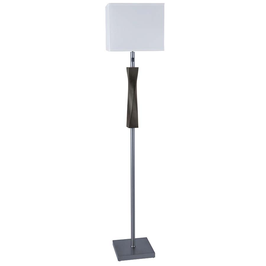 60" Faux Walnut and Brushed Nickel twist Floor Lamp, medium base socket, on/off rocker switch at neck, 12' Silver 45° cord, 8x15x8x15x10 Rectangle White Linen Hardback Shade. Recommend 1100 lumen LED bulb.