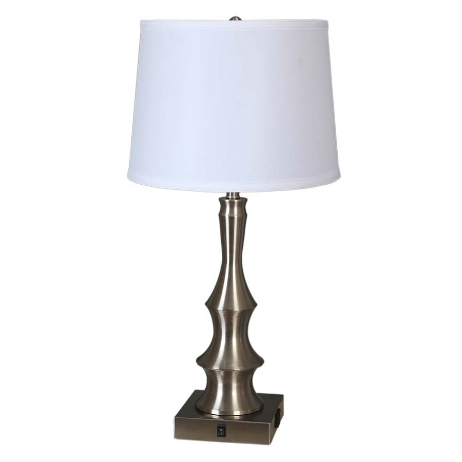 28"H Brushed Nickel Table Lamp, medium base socket, on/off rocker base switch, two convenience outlets, 8' Silver 45° 3-prong grounded cord, 11x15x10 White Linen Hardback Shade. Recommend 1100 lumen LED bulb.