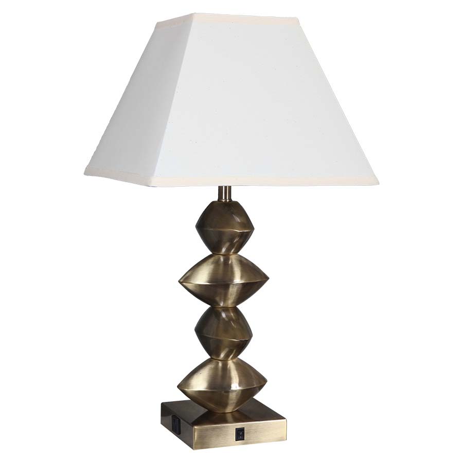 27.5"H Brushed Brass Table Lamp, medium base socket, on/off rocker base switch, two convenience outlets, 8' Silver 45° 3-prong grounded cord, 7x7x15x15x11 Natural Linen Hardback Shade. Recommend 1100 lumen LED bulb.