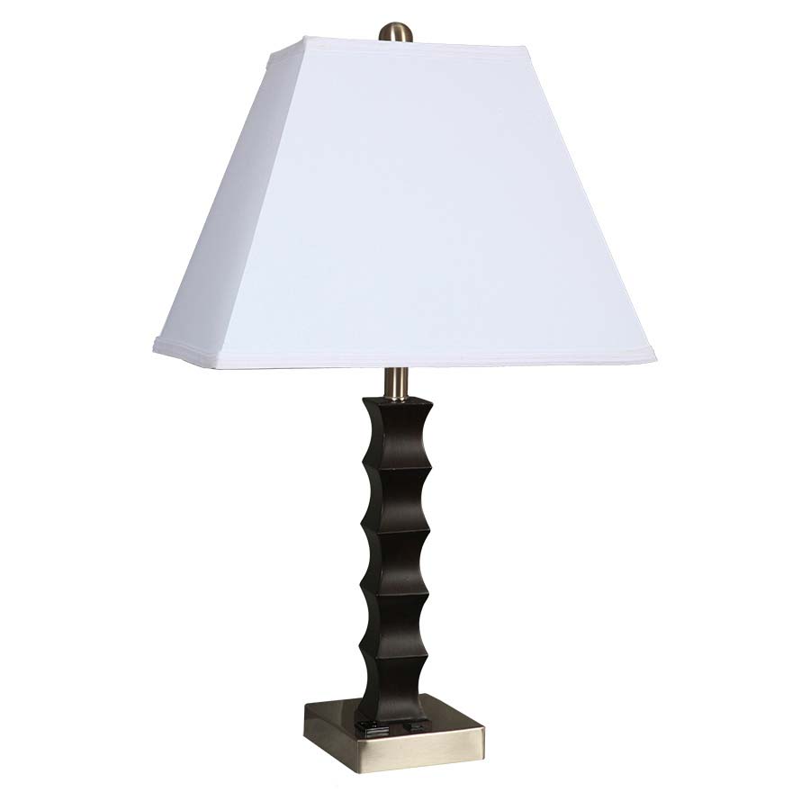 26.75"H Brushed Nickel and Espresso Table Lamp, medium base socket, on/off rocker base switch, 8' Silver 45° 3-prong grounded cord, one convenience outlet, 5x8x10x16x11 White Linen Hardback Shade. Recommend 1100 lumen LED bulb.