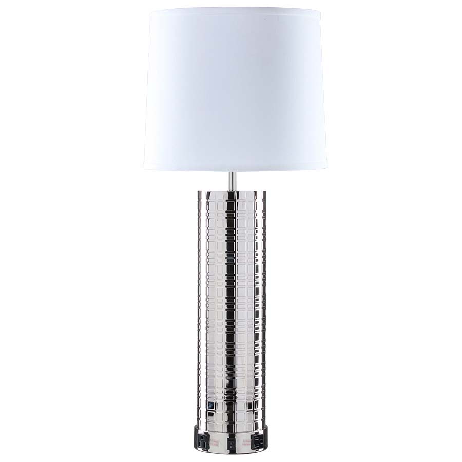 31"H Polished Nickel Table Lamp ,medium base socket, on/off rocker base switch, two convenience outlets, 8' Silver 45° 3-prong grounded cord, 12x13x11 White Linen Hardback shade. Recommend 1100 lumen LED bulb.