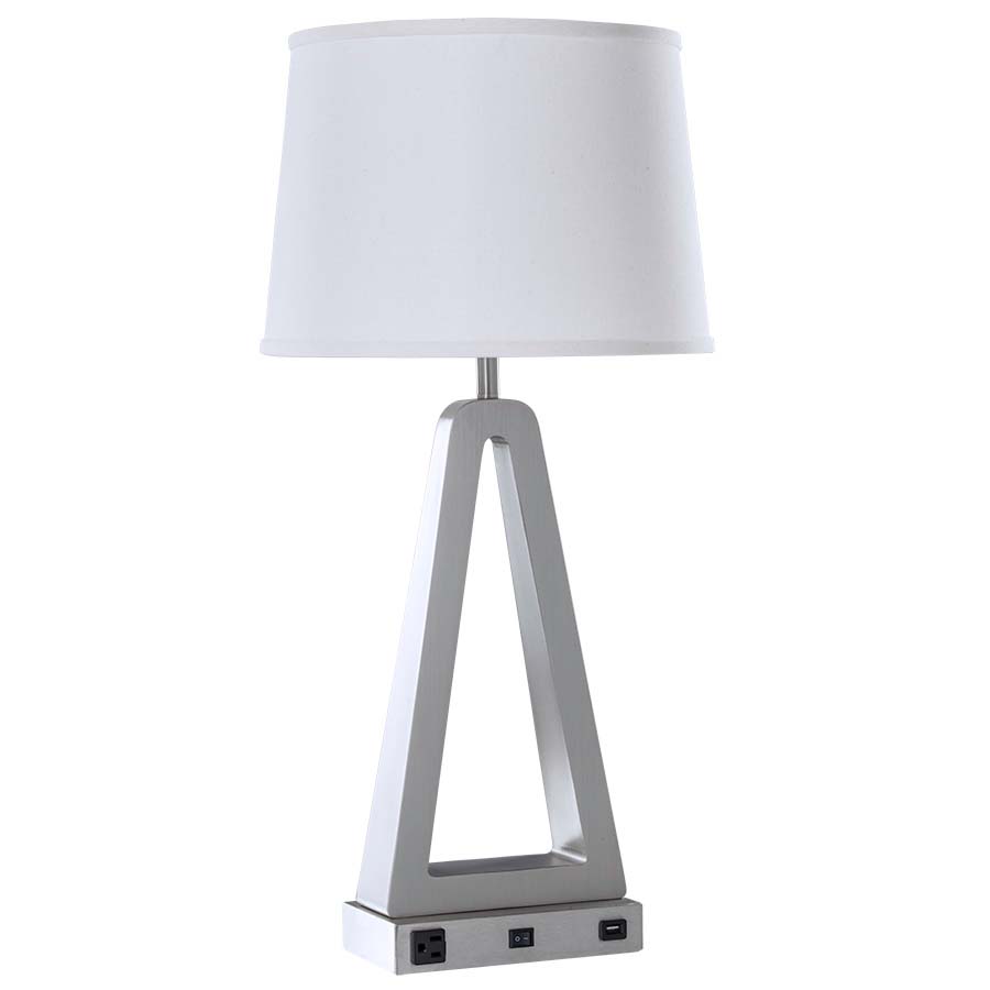 28.25"H Brushed Champagne Table Lamp, medium base socket, on/off rocker base switch, with one outlet, Dual USB port, 8' Silver 45° 3-prong grounded cord, 12x14x10 Natural Linen Hardback Shade. Recommend 1100 lumen LED bulb.