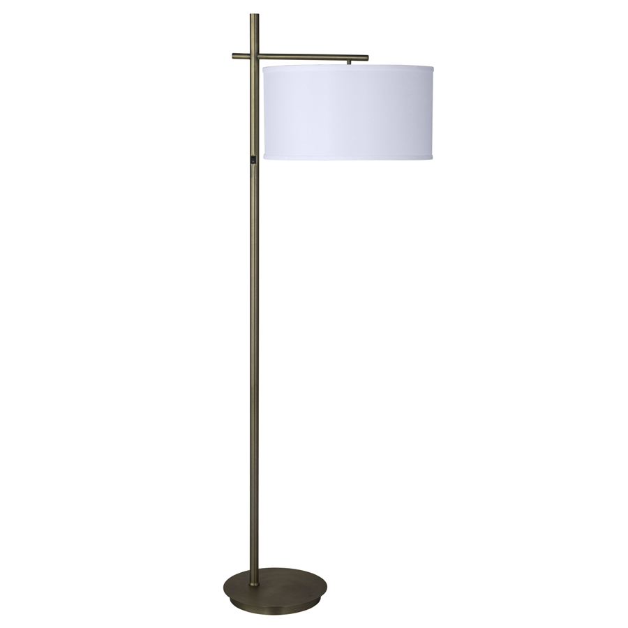 62.5"H Brushed Brass Floor Lamp, medium base socket, on/off rocker switch on column @ 48"AFF, 8' Silver 45° cord, 17"x17"x8.5" White Linen Hardback Shade. Recommend 1100 lumen LED bulb.