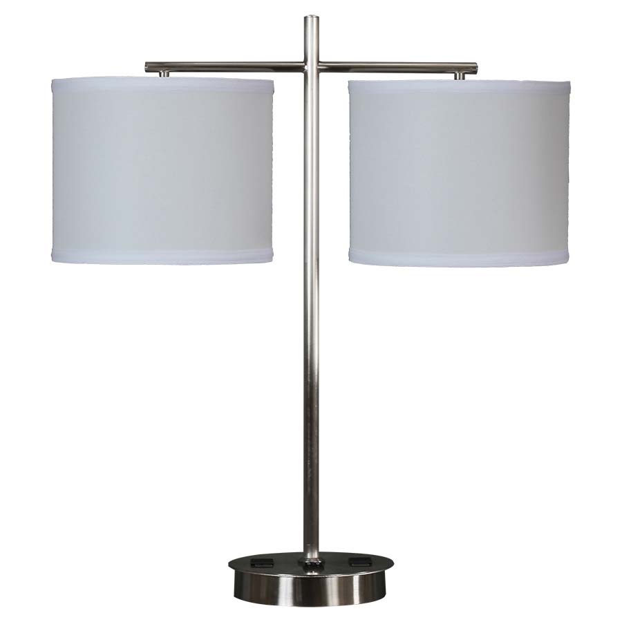 26.5"H Brushed Nickel Table Lamp, two medium base sockets, dual on/off rocker base switch, one outlet, dual USB A + C port, 8' Silver 45° 3-prong grounded cord, two 10x10x7 White Linen Hardback shades. Recommend two 1100 lumen LED bulbs.
