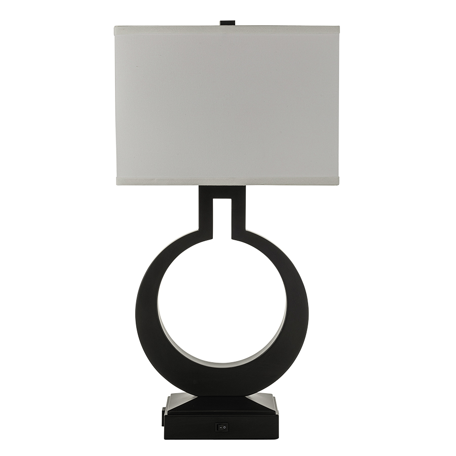 27.25"H Pottery Bronze Table Lamp, medium base socket, on/off rocker base switch, one outlet, one USB port, 8' Silver 45° 3-prong grounded cord, 8"x14"x8"x14"x10" Rectangle White Linen Hardback Shade, 9" Harp & Finial, Recommend 1100 lumen LED bulb.