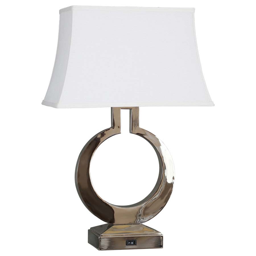 27.5"H Polished Nickel Table Lamp, medium base socket, on/off rocker base switch, 8' Silver 45° cord, 8"x14"x10"x18"x11" Rectangle Cream Linen Hardback shade. Recommend 1100 lumen LED bulb. (picture does not reflect correct shade)