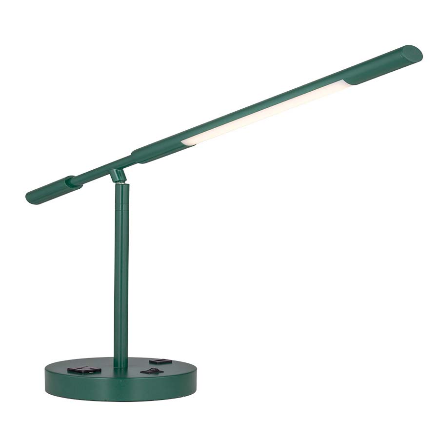 Starboard LED Desk lamp with up/down and side-to-side articulating arm. 3 watts 240 lumens 2700K LED array, on/off rocker base switch, one convenience outlet, one USB port. 8' Silver 45° 3-prong grounded cord, 17" extension, Adjustable 15"H - 31-7/8"H