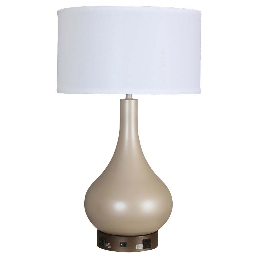 26.5"H Champagne and Naples Bronze Table Lamp, two medium sockets, dual on/off rocker base switch, 8' Silver 45° 3-prong grounded cord, with two convenience outlets, 14"x14"x9" White Linen Hardback Shade. Recommend two 800 lumen LED bulbs.