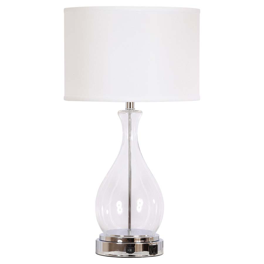 28"H Polished Nickel and Clear Glass Table Lamp, medium base socket, on/off rocker base switch, 8' Silver 45° 3-prong grounded cord, one convenience outlet, 15x15x10 White Linen Hardback Shade, 8" Harp & Finial, Recommend 1100 lumen LED bulb.