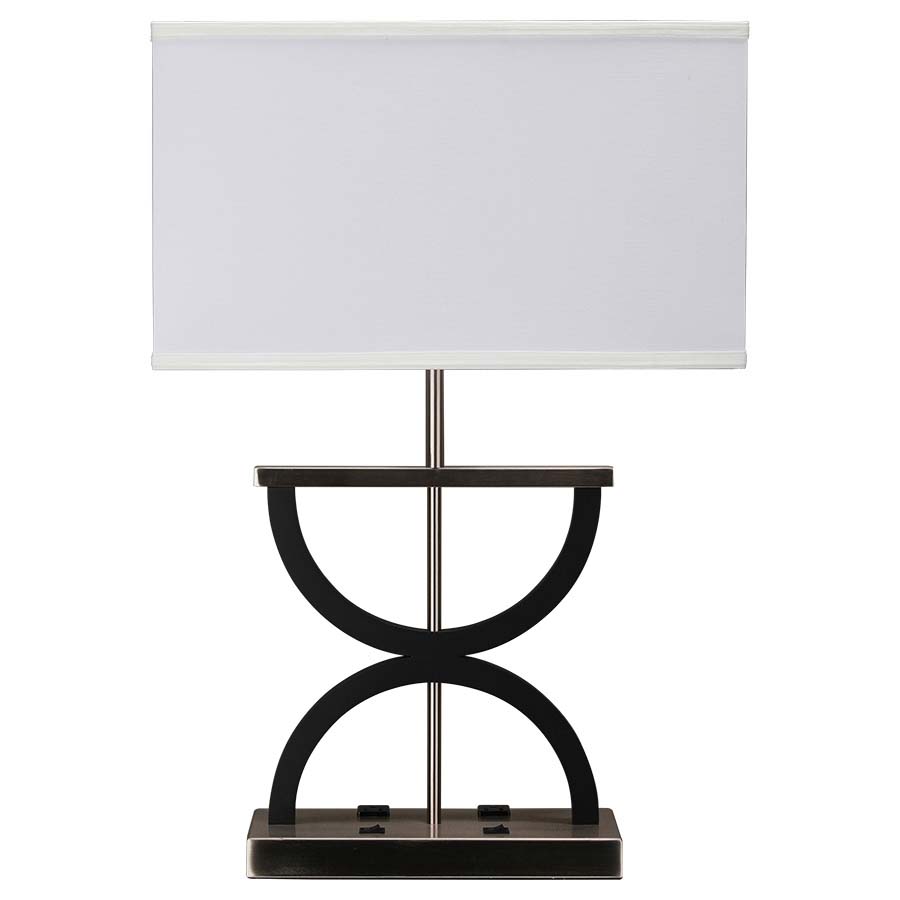 27"H Brushed Nickel and Black Wood Table Lamp, dual medium socket, 2-on/off rocker base switches, 8' Silver 45° 3-prong grounded cord, two outlets. 10"x18"x10"x18"x10.5" Rectangle White Linen HB Shade. Recommend two 1100 lumen LED bulbs.