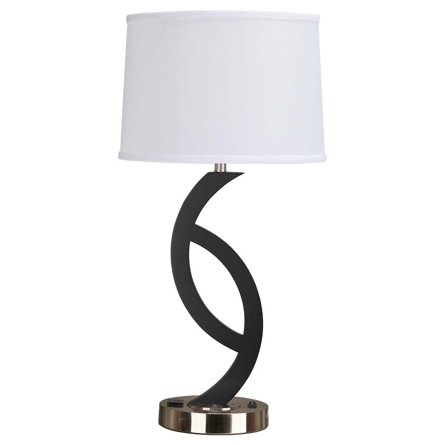 26" Brushed Nickel and Black Table Lamp, medium base socket, on/off rocker base switch, 8' Silver 45° 3-prong grounded cord, with one convenience outlet, 13"x14"x10" White Linen Hardback Shade. Recommend 1100 lumen LED bulb.