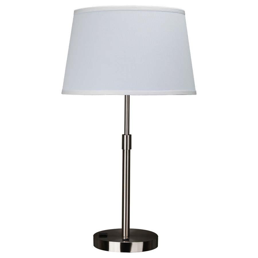 29"H Brushed Nickel Table Lamp, medium base socket, on/off rocker base switch, 8' Silver 45° 3-prong grounded cord, with one convenience outlet. 13"x16"x10" White Linen Hardback Shade. Recommend 1100 lumen LED bulb.