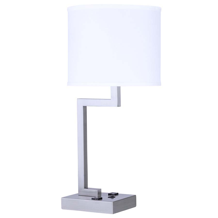 26"H Brushed Nickel Table Lamp, medium base socket, on/off rocker base switch, 8' Silver 45° 3-prong grounded cord, with two convenience outlets, dual USB port. 12"x12"x10" White Linen Hardback Shade. Recommend 1100 lumen LED bulbs. (dual USB port not shown in picture)