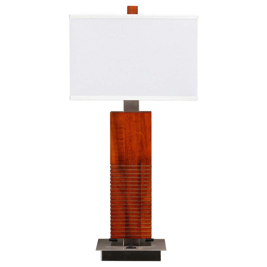 30.5" Dark Willow Wood Table lamp with Brushed Nickel accents, medium base socket, on/off rocker base switch, two outlets at back of lamp, 8' Silver 45° 3-prong grounded cord, 8x15x8x15x10 Rectangle White Linen HB Shade Recommend 1100 lumen LED bulb.
