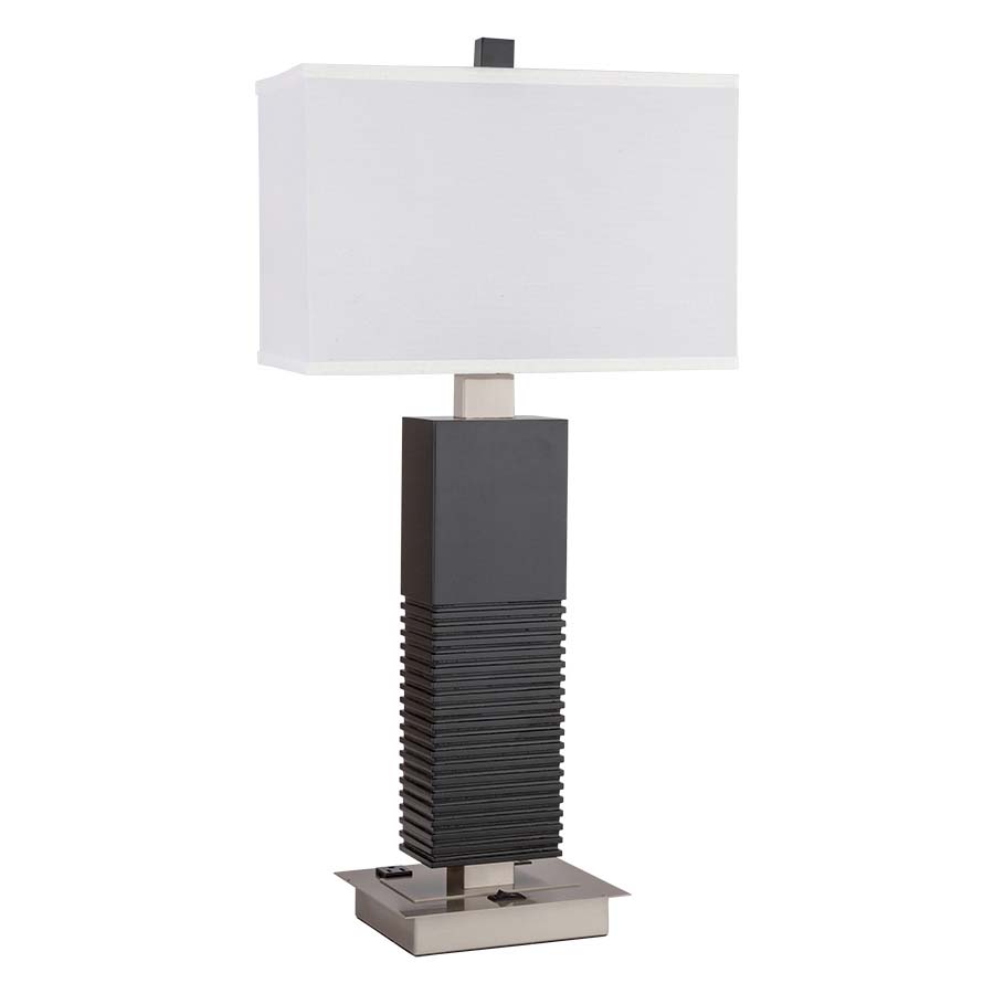 107.4130.5"H EspressoTable lamp with Brushed Nickel accents, medium base socket, on/off rocker base switch, one outlet, one USB port, 8' silver 45° 3-prong grounded cord, 8x15x8x15x10 Rectangle White Linen Hardback Shade. Recommend 1100 lumen LED bulb.